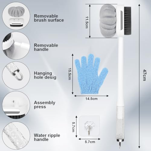 Package Includes: You will receive a double-sided bath brush, a exfoliating glove, and a hook; You can wet your body, use the scrubbing mitt to remove the hard dead skin and cuticles, and then use the body brush to clean the skin