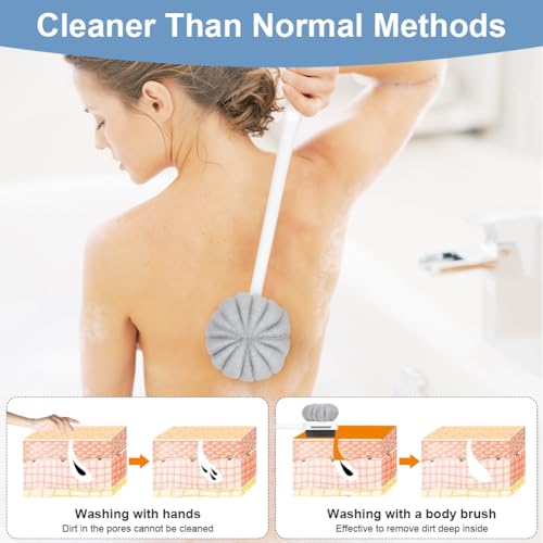 Double-Sided Design: One side of the shower brush is a soft brush, which can deeply clean the pores dirt and provide an excellent cleaning experience for your skin; the back is a loofah bath ball with rich bubbles