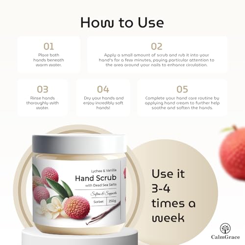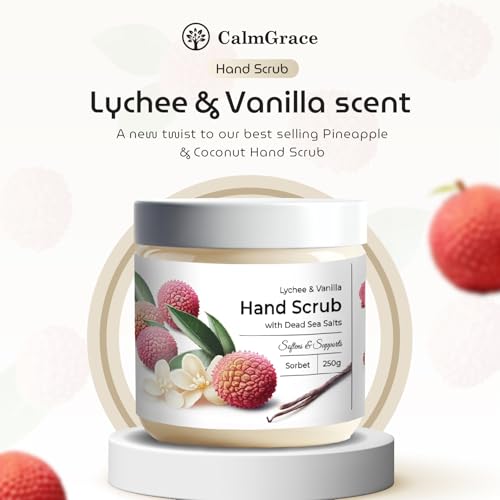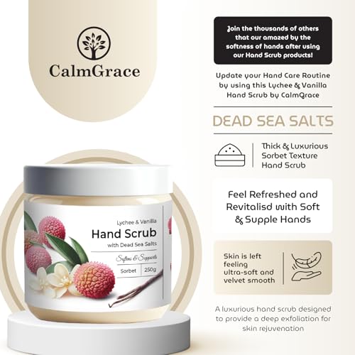 CalmGrace Exfoliating Hand Scrub with Dead Sea Salts – Lychee & Vanilla Scent | Hand Scrub Exfoliator with Sorbet Texture Enhanced with Aloe Vera, Coconut Oil, Vitamin C | 250g | Sweet & Fruity Aroma