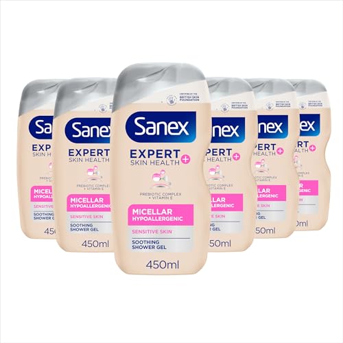 Sanex Expert Skin Health+ Micellar Hypoallergenic Shower Gel 450ml X 6- For Sensitive Skin – Body Wash For Men & Women – Helps Protect Skin From Pollution – Gentle Antioxidant Formula – with Vitamin E