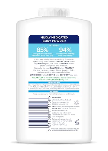 Relief for eczema-prone, irritated and dry skin. The Mildly Medicated Talcum Free Body Powder from CUTICURA has been specially formulated to be effective for combating the symptoms of eczema-prone, irritated and dry skin. Gentle yet highly effective combination of two natural skin protecting active ingredients: ALLANTOIN is a naturally soothing and non-irritating active that has the ability to help heal the skin and stimulate the growth of healthy tissue. ZINC OXIDE is a natural mineral renowned for its skin soothing properties. Dermatologically tested and approved for skin kindness. CUTICURA Mildly Medicated Body Powder is specifically formulated to soothe, protect and help restore your skin back to comfort when prone to dryness and irritation. Naturally derived powder helps protect the skin by absorbing moisture, keeping it dry and preventing rubbing and chafing. Zinc Oxide helps soothe and comfort dry skin. Allantoin is renowned for its ability to soothe, soften and condition dry skin
