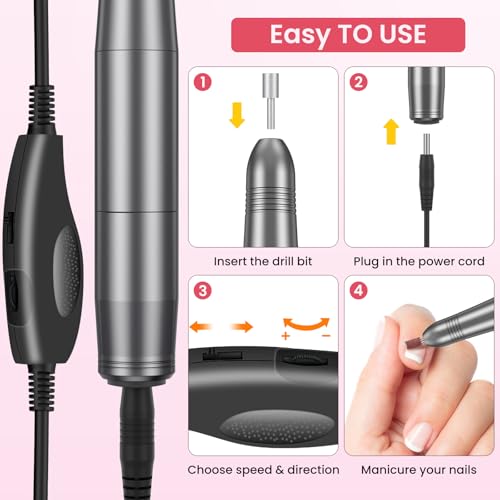 Professional Nail Drill – Come with 1 electric nail drill, 6 different nail drills bits, 16 sanding bands, 1 brush. Our electric nail drill set can be used for manicures, pedicures, polishing, shaping, grinding cuticles, removing acrylic/gel nails, or for pet nails beauty. Easily to treat your nails at home!