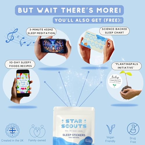 What’s Included: The StarScouts sleep aid without melatonin set contains 30 x sleeping aid patches for kids and adults, as well as 3 x sleep chart, 1 x sleep hygiene guide, 1 x sleepy time story, 1 x 432Hz kids meditation, 1 x Sleep-inducing foods cookbook that promise a rewarding and enjoyable bedtime experience!