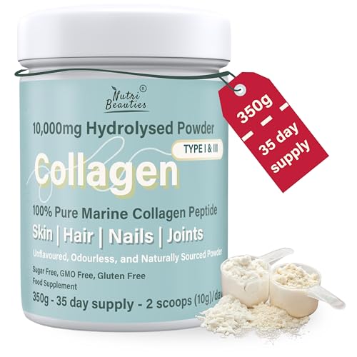 NUTRI BEAUTIES Pure Marine Collagen Peptides Powder 10,000Mg | 19 Essential Amino Acids | Unflavoured 350g Hydrolyzed Collagen Supplements for women and men (Type I, III) | 35 Day Supply |Halal | skin