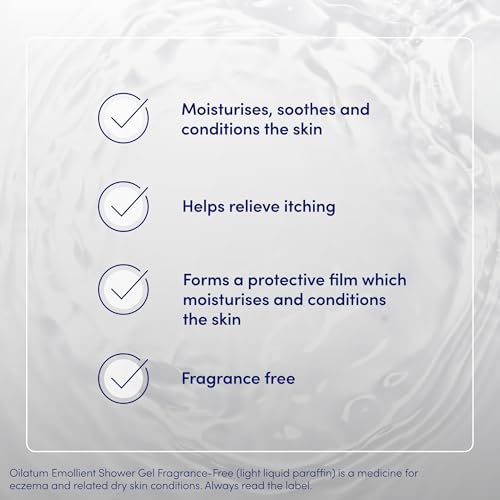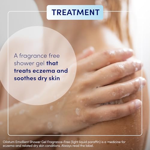 Product Description: Treat your eczema with Oilatum Shower Gel Fragrance Free, formulated for the treatment of eczema and related dry and itchy skin conditions. This effective formula is specially developed to use in the shower, containing a non-foaming emollient gel. If you are suffering with eczema and related dry skin conditions, Oilatum Shower Gel Fragrance Free provides relief for your skins needs, it soothes, moisturises and conditions your skin whilst stopping loss of moisture. Oilatum Shower Gel Fragrance Free provides soothing relief and helps relieve itching. It forms a protective emollient film which moisturises and conditions your skin and stops the loss of moisture. Our shower gel cleanses the skin and contains no fragrances; therefore, it is unlikely to irritate sensitive skin. Suitable for adults and children with eczema and itchy, dry skin. Directions: Oilatum Shower Gel Fragrance Free can be used as frequently as necessary; Shower as usual and apply liberally to wet skin and massage gently. Rinse off with warm water and lightly pat the skin dry. Oilatum has been trusted for 50 years by families to relieve dry and eczema-prone skin. Known for its products that provide relief and hydration for dry and itchy skin conditions such as eczema. Oilatum products are expertly formulated to soothe and hydrate, offering comfort and protection. Discover Oilatum and let your skin experience the soothing protection it deserves. Ideal for sensitive skin, Oilatum’s gentle formulations address dryness and irritation with ease and confidence. People around the globe use Oilatum for its ability to deliver hydration and relief, establishing it as a staple in personal and family skincare regimens. Oilatum Shower Gel Fragrance Free Ingredients: Active ingredient: Light Liquid Paraffin 70% w/w. Each gram of gel contains 700mg of Light Liquid Paraffin. Other ingredients: polyethylene, 2- octadodecanol, polyethylene glycol 400 dilaurate, polyoxyethylene 40 sorbitol septaoleate, polypropyleneglycol-2-myristyl ether propionate, polyphenylmethyl siloxane copolymer. Oilatum Shower Gel Fragrance Free (light liquid paraffin) is a medicine to treat eczema and related dry skin conditions. Always read the label.