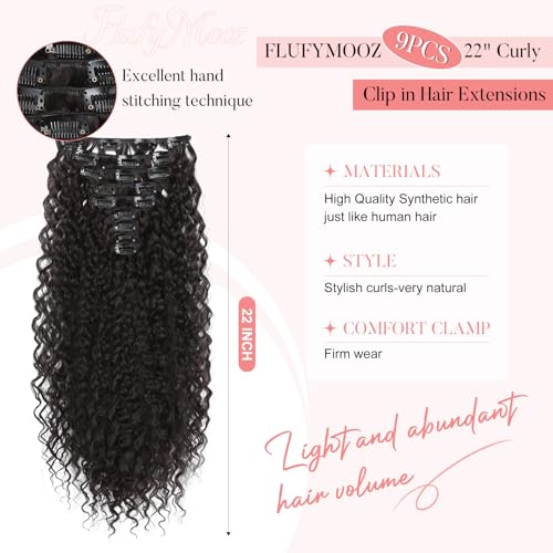FLUFYMOOZ 9PCS Clip in Hair Extensions 22 Inch Curly Hair Extension Long Soft Synthetic Hairpieces for Women (Black Brown)
