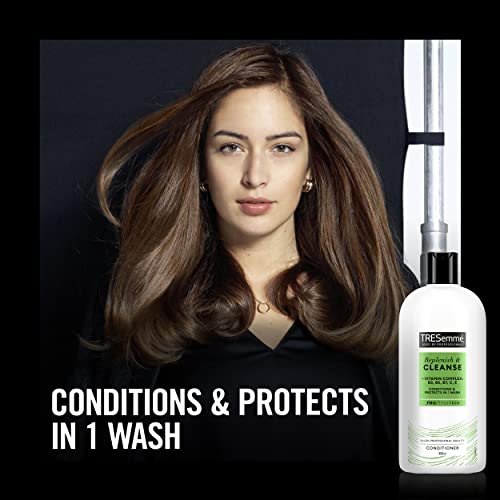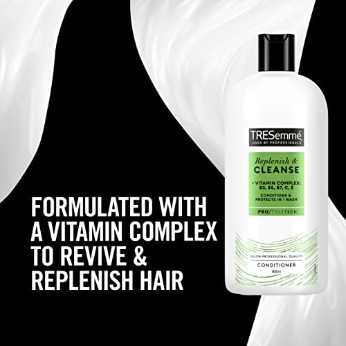 After shampooing with Tresemme Replenish & Cleanse Shampoo, distribute Replenish & Cleanse Conditioner evenly through damp hair, leave on for 2–3 minutes, and then rinse thoroughly