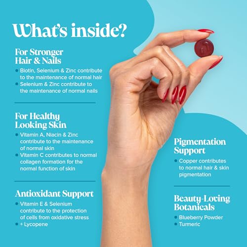 12-IN-1 BEAUTY COMPLEX: Our chewable gummies, enriched with 12 vitamins and minerals, support glowing & healthy skin, reduce breakage, and promote glossy hair and nail growth. Just two tasty chewables per day provide your hair and skin with all the essential nutrients they need