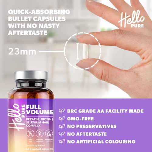 Hello Pure Full Volume Hair Growth Vitamins for Women & Men – 60 Biotin (Vitamin B7) Supplement Capsules – with Keratin, Selenium & Iron, Flaxseed – Skin, Hair & Nails – GMO Free
