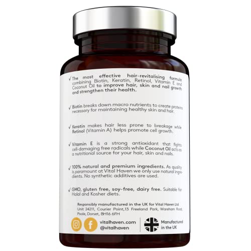 ![[Vital Haven] Complex Hair Formula - Biotin & Keratin with Vitamin A & E and Coconut - High Strength - 2-Month Supply - Premium Ingredients - for Stronger Hair and Skin - Made in The UK - Image 3](https://m.media-amazon.com/images/I/41JolPQr1CL.jpg)
