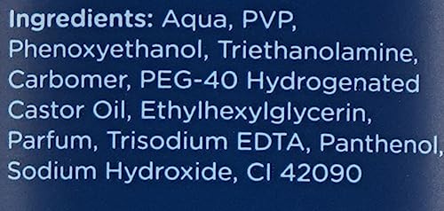 Water, PVP, Carbomer – Polymer, Triethanolamine –pH adjuster, PEG-40 Hydrogenated Castor oil – water soluble wax of castor oil, Propylene Glycol, Panthenol – Humectants, Rest – Preservatives, Perfume and colour.