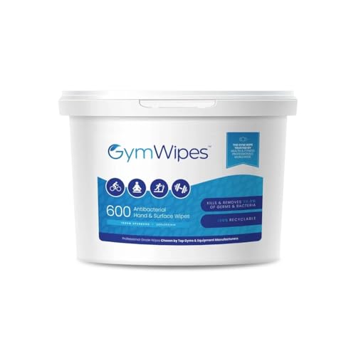 Gym Wipes – 600 Heavy-Duty Antibacterial Wipes in Bucket Dispenser – Eliminates 99.9% of Germs – Perfect for Gyms, Fitness Studios, Health Clubs, Offices & Homes – Refillable Bucket
