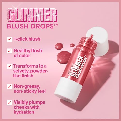 Shake, click, blend and glow. Revlon Glimmer Blush Drops gives you a healthy flush of color with just one drop. No guesswork. Designed with an easy precision dropper, this 1-click blush dispenses the perfect amount of highly pigmented color. One drop is all you need for both cheeks. It blends smoothly and evenly, easily transforming from a lightweight liquid to a velvety, powder-like finish. The serum-like texture visibly plumps cheeks with hydration and provides an instant, lifted effect without any greasiness or stickiness. Formulated with Glycerin for smoother blending. Available in 3 fun, glowy shades.