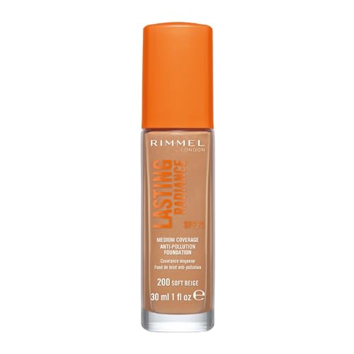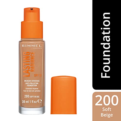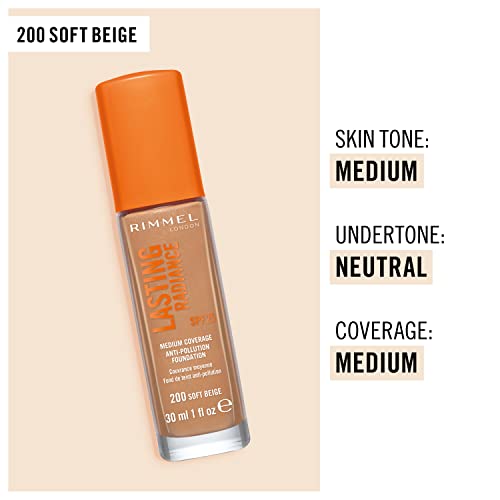 Rimmel Lasting Radiance Medium Coverage Anti Pollution Foundation, SPF 25, 200 Soft Beige (Wake Me Up Foundation Improved Formula), 30 ml (Pack of 1)