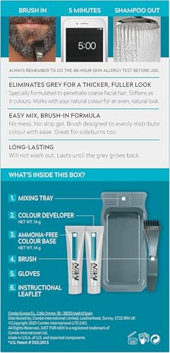 This men’s beard colouring product is easy to use. Simply mix the colour base and developer, use the brush to apply, wait five minutes, rinse the product out, shampoo, and you’re done. Be sure to read and follow the enclosed leaflet for the best results
