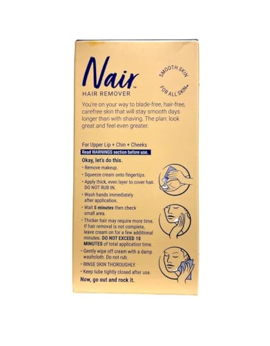 Partial directions: Apply the Nair Hair Removal Cream to face, avoiding sensitive areas. Leave on for a few minutes, allowing the cream to work on the hair. Rinse off thoroughly with warm water.