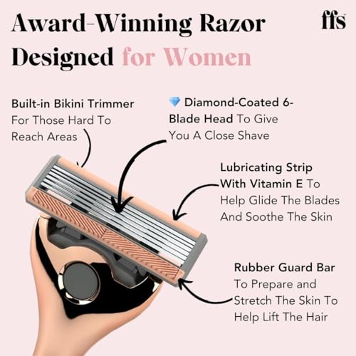 STARTER RAZOR SET – Begin your FFS journey with this Peony razor set for women. Including a super stylish handle with a pack of 2 premium 6 blade diamond-coated titanium cartridges with a lubricating Vegan-Friendly vitamin E strip and a matching shower holder – For Feel-good’s Sake