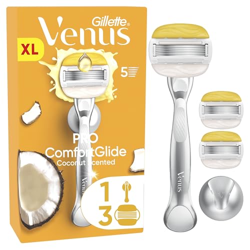 Gillette Venus Pro ComfortGlide Coconut Scented Women’s Razor with Olay Moisturiser, 1 Refill Razor Cartridges, Reusable Metal Handle and Shower Holder