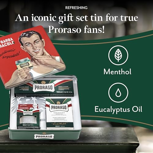 Everything needed for a smooth, close, invigorating shave is found inside this men’s shaving kit gift set. Each product is formulated with Eucalyptus Oil and Menthol to refresh and revitalise skin. Presented in a stylish tin and decorated with vibrant vintage Proraso artwork. The illustration of “Gino” dates to 1956 and was the first Proraso advertising, followed in 1961 by “Toccasana” and “Prima e Dopo” in 1962. For over 70 years, Proraso has redefined shaving with timeless classics that well-groomed men return to time and time again.