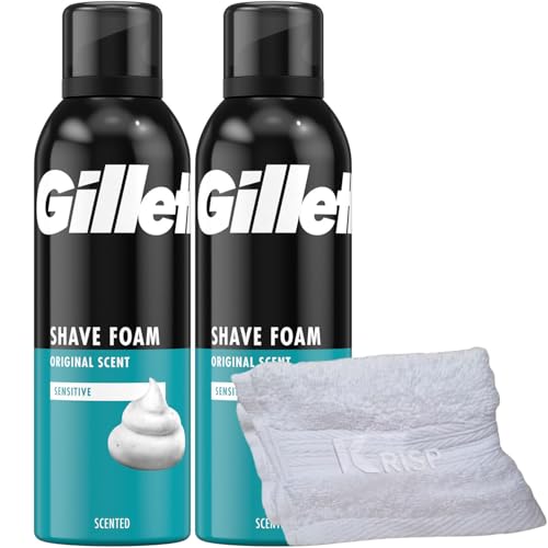 2 x 200ml Men Shaving Foam Mousse Sensitive Skin Face Body Soft Clean With Soft Aftershave KRISP Towel