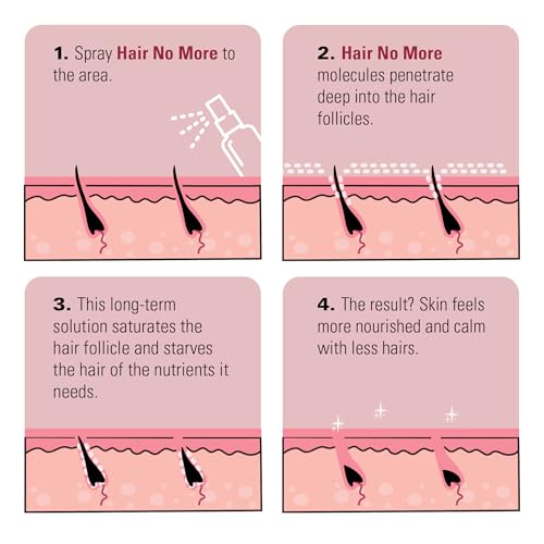 1. Apply a generous amount of Hair No More Inhibitor Spray to areas where hair has been removed. 2. Gently massage the spray into the skin until completely absorbed. 3. Make sure the spray is completely absorbed before applying other products to the same skin area. 4. Use daily for the first week, then twice a week thereafter to maintain the slowing action of hair regrowth. 5. Use more frequently if hair is very thick and dark.