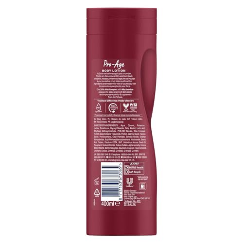 Dove Pro age nourishing body care body lotion contains AHA, olive oil and vitamin B3 for natural skin rejuvenation