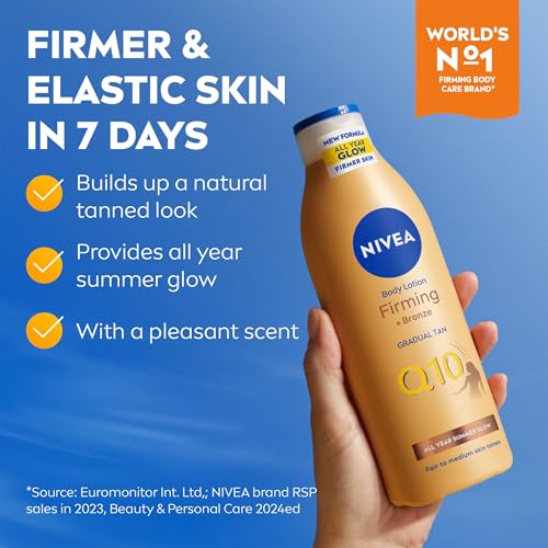 NIVEA Q10 Firming + Bronze Gradual Tan Body Lotion (400 ml), Tan Activating Firming Cream with Q10, Supports a Gradual Tan, Tanning Moisturiser for a Sun-Kissed Radiant Glow