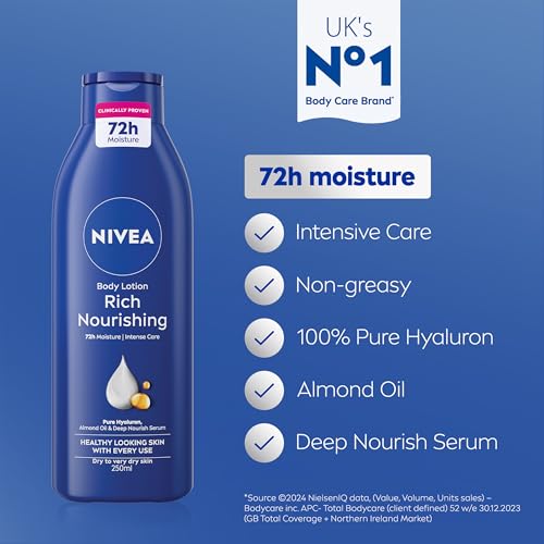 NIVEA Rich Nourishing Body Lotion (250ml), Rich 72H Hydration NIVEA Moisturiser for Dry Skin Made with Deep Moisture Serum and Almond Oil, Intensive Hydration NIVEA Body Lotion