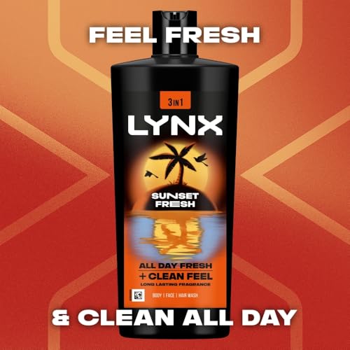 FRESH & CONFIDENT: Boost your confidence with every shower using Lynx Sunset Fresh XXL Body Wash. Its refreshing 3-in-1 formula cleanses hair, face, and body, ensuring you step out of the shower feeling energised and invigorated. The vibrant citrus scent lingers, providing you with an all-day clean feel and irresistible freshness.