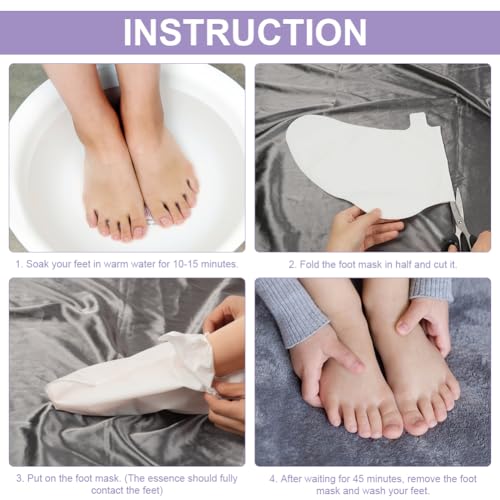 ✅【EASY TO USE】Soak your feet in warm water for 10-15 minutes before use, then fold and cut the foot mask in half, clean and dry your feet, put it on and gently press the outer layer of the mask cloth with your hands to make the legs closely contact with the essence. After 20-30 minutes, remove the foot mask and rinse with water. There is no need to peel it yourself, the old skin will fall off automatically after a few days.
