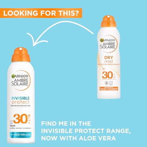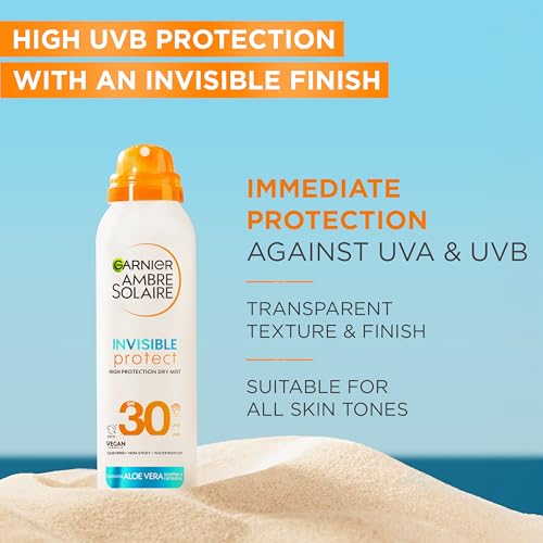 Garnier Ambre Solaire Invisble Protect Dry Mist SPF 30, fast absorbing, high UVA & UVB protection, water resistant, invisible finish, non-sticky sunscreen, 150ml