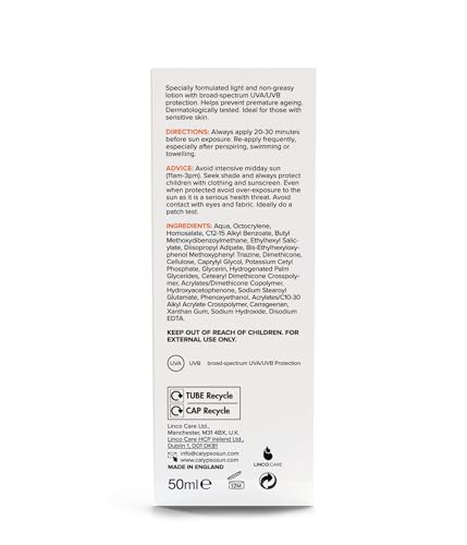 Calypso Sensitive lotion for face and neck SPF50+ offers high UVA and UVB protection to help reduce the risk of sun-induced skin damage. It is a specially formulated light and non-greasy sun lotion that helps prevent premature ageing. Ideal for delicate skin on face and neck, ideal for kids and those with sensitive skin. The formula is water resistant, light, non-greasy and absorbs quickly. It contains gentle moisturisers that replenish natural oils lost due to exposure to the sun, wind and water. Dermatologically tested.