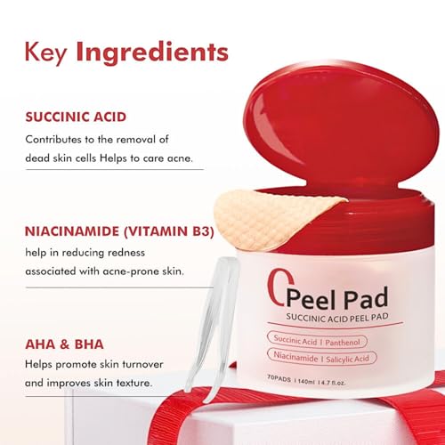 Red Succinic Acid Panthenol Face Exfoliator Pads, 70Pads Exfoliating Toner Pads for Acne Prone Skin, Exfoliating Face Fads, Zero Pore Pads, with Niacinamide, AHA, BHA, Reduce Blackheads