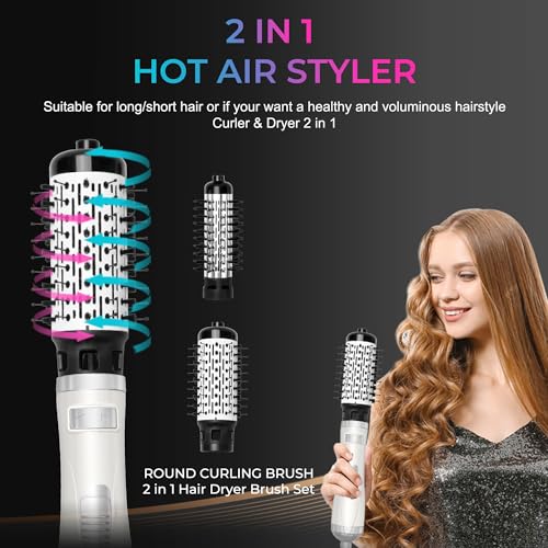 【2 in 1 dryer brush】 hair air brush has 2 heads: 38mm/50mm round brush & dryer Brush), powerful enough to blow-dry long/short from wet with cold ironing function. The button on the curling head allows you to change the brush head at the touch of a button, allowing you to create as many curls and tousled styles as you need.
