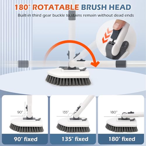 180° Rotation Brush Head and Lock: The brush head can be rotated 180 degrees to clean dust and stains in crevices and corners. The shower cleaning brush is designed with a lock button on the handle that allows the brush head to be locked at 3 angles (90°, 135°, 180°), stays stable, and won’t loosen when cleaning