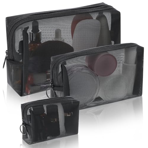Wanmu 3Pcs Mesh Makeup Bags, Mesh Cosmetic Bag, Portable Toiletry Bag, Travel Organizing Zipper Pouch, Toiletries Makeup Pouches, Black Breathable Mesh for Home Office Travel Accessories