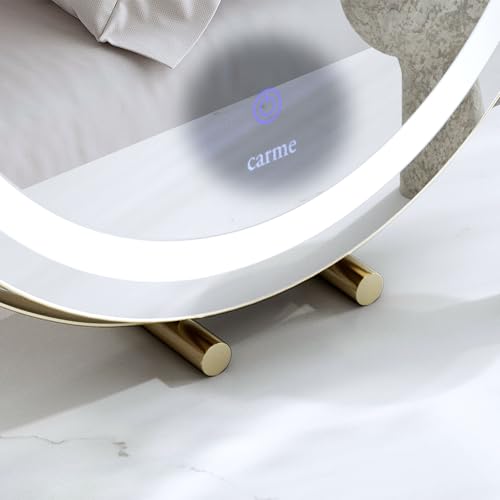 FABS Desktop Vanity Illuminated Makeup Mirror with Touch LED Lights Sensor 3 Colour Settings Dimmable Brightness Lighted Ring Dresser Mirror Gold Frame and sturdy cylindrical stand (Riley Gold)