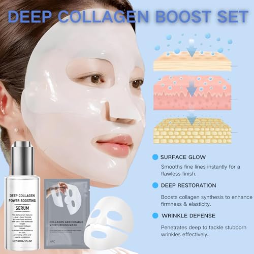 2PCS Glass Skin Korean Skincare Set, Overnight Collagen Face Mask & Deep Collagen Boost Anti Aging Serum, Hydrating Colla gen Sheet Mask, Dark Spot Correcting Glow Serum, Firming, Wrinkle Filler