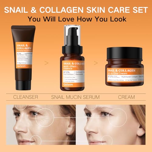 【Collagen & Snail Mucin Korean Skin Care Set】Our 97.5% Snail Mucin Skin Care Set includes a complete routine for radiant skin: Cleanser, Serum, Moisturizer. This anti-aging skin care set repairs dryness, soothes sensitivity, and boosts elasticity with Snail Collagen – perfect for all skin types (normal, dry, combination).
