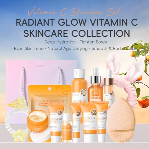 【Vitamin C Skincare Gift Set】LAIKOU Vitamin C Skincare Set offers a complete facial care routine: cleanser, toner, serum, eye cream, moisturizer, sunscreen, and hair accessories. Formulated with Vitamin C and natural extracts, this pamper gift set for women nourishes, protects, and revitalizes the skin, addressing dullness, dryness, and sun damage for a refreshed, radiant complexion.