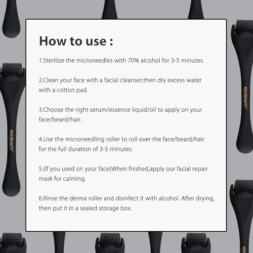 ✅EASY TO USE: Microneedle roller: Sterilize before each use and roll the treated area vertically and horizontally about 6-8 times before applying your favorite skin products. If you want to use micro needle roller for hair and beard growth, we recommend pairing it with minoxidil to double the effect. Dermatologists recommend using face roller/ hair roller/ beard roller at home.